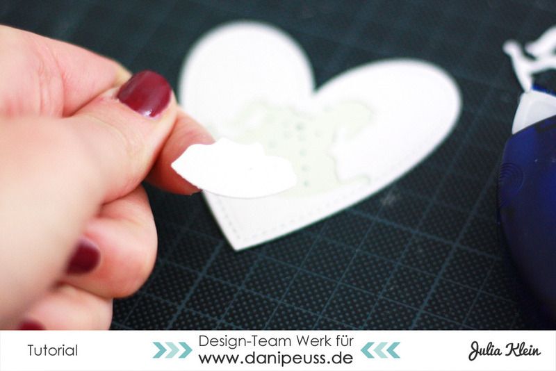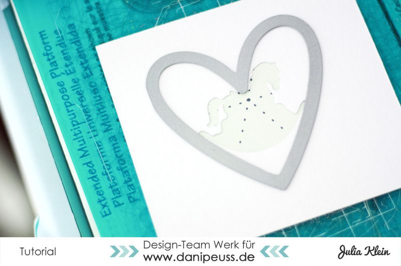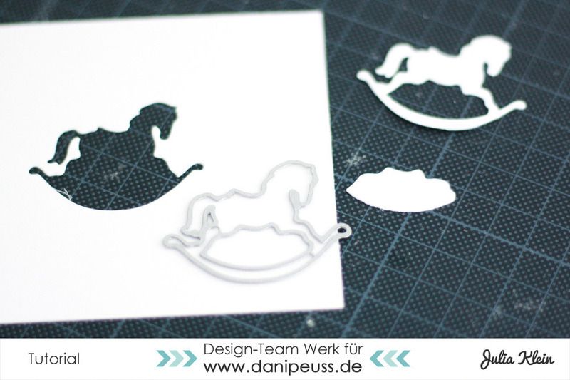 Von hinten habe ich dann gemustertes Papier angeklebt, sodass die Fläche des ausgestanzten Schaukelpferdes bedeckt ist und man nicht mehr durchschauen kann. Darauf kommt dann das Herz und ihr seht schon das es sehr knapp ist mit der Ausstanzung. Aber es funktioniert. Wenn ihr unsicher seid, ob alles an Ort und Stelle bleibt, nehmt einfach ein kleines Stückchen