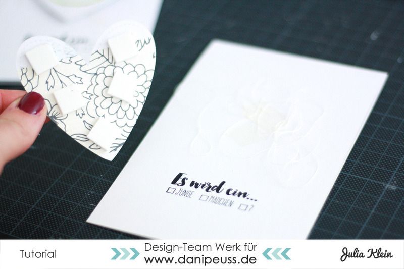 Denn die Papierstrampler habe ich dann mit etwas höherem doppelseitigem Klebeband auf dem Kartenrohling aufgeklebt. Ihr könnt dafür natürlich auf 3D-Klebepads verwenden. Einfach das, was ihr zur Hand habt.