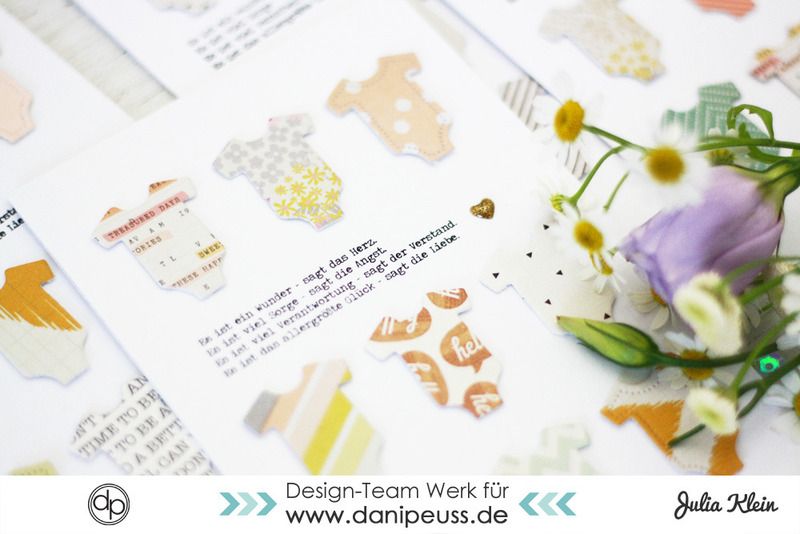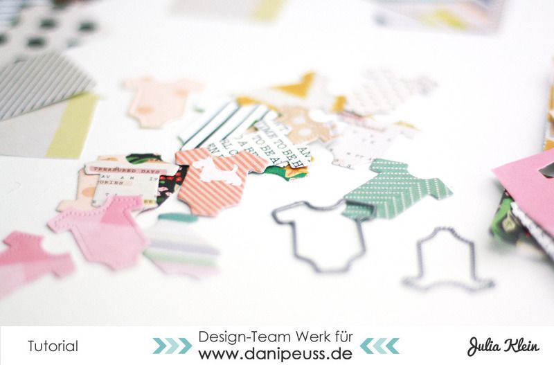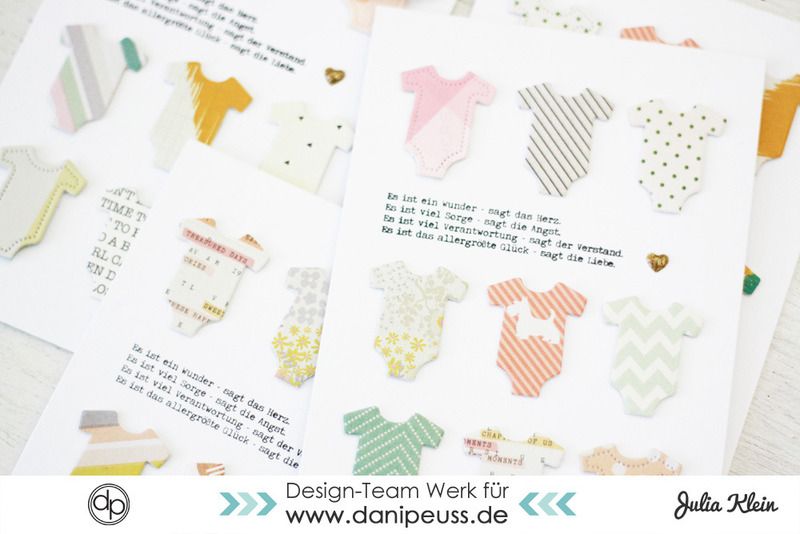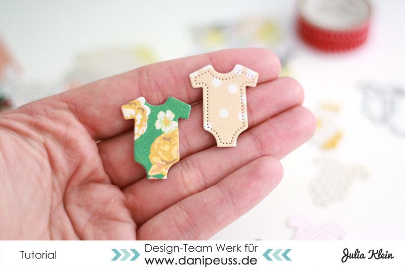 So sah es dann zwischenzeitlich mal auf meinem Tisch aus. Viele kleine Babystrampler aus Papier und ich hätte immer weiter machen können. Beim stanzen könnt ihr total schön mit dem gemusterten Papier spielen und die Stramplerstanze so platzieren, dass der Babystrampler ein tatsächlich richtig hübsches Muster bekommt. Mir gefiel ja die Variante mit dem Hund auf der Brust sehr gut. Oder auch das "Hello" in der Sprechblase.