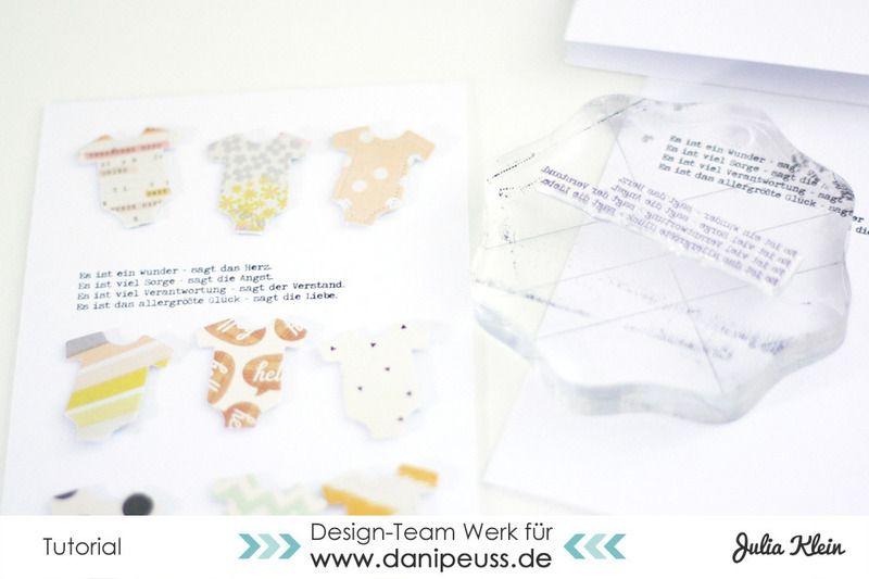 Auf meinen Karten habe ich jeweils neun der Babystrampler aus Papier ausgelegt und entsprechend sortiert. Ihr könnt eure eigenen Farbschemen entwickeln, einen Farbverlauf oder was auch immer euch in den Kopf kommt. Vielleicht macht ihr aber auch einfach nur Karten mit einfarbigem Cardstock. Das sieht bestimmt auch sehr edel aus. Aber zurück zu meinen Karten, neun Strampler sollten es sein und dazwischen habe ich einen Stempelabdruck platziert. Dazu wurden die Papierelemente entsprechend ausgelegt und der Stempel mit dem schwarzen Stempelkissen eingefärbt und auf dem Kartenrohling abgestempelt. Das habe ich bewusst vor dem aufkleben der Strampler gemacht, damit ich diese nicht mit der Farbe des Stempelkissen verunreinige und den Stempelabdruck sauber auf dem Kartenrohling aufdrücken kann.