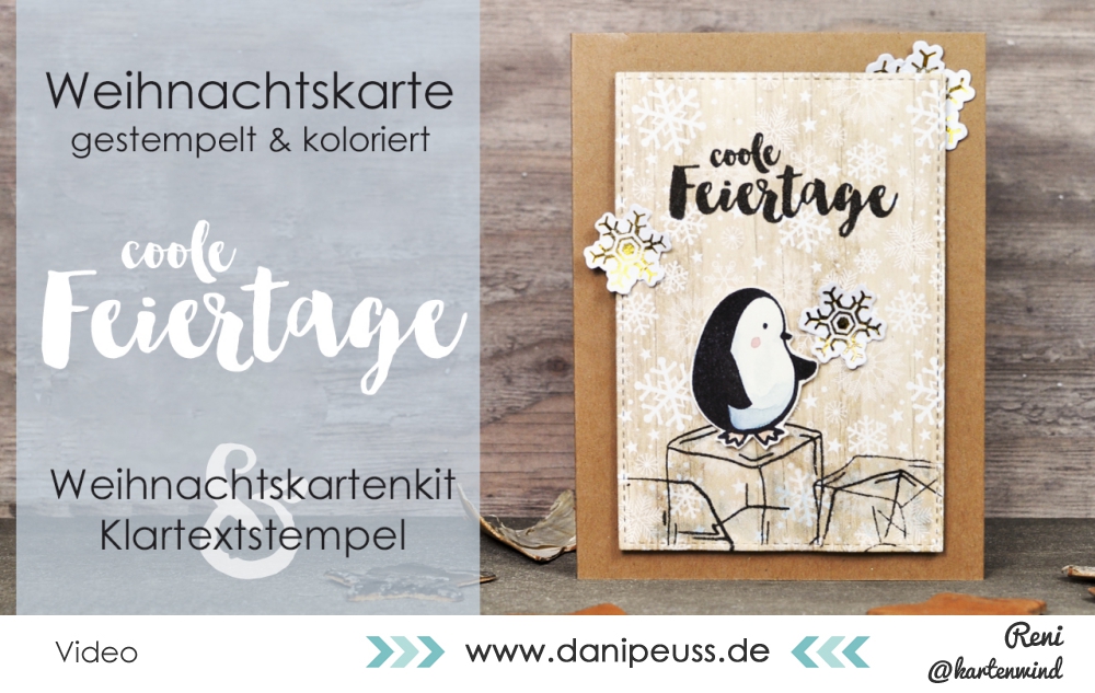 So viele schöne Weihnachtsstempel gibt es im Klartext-Sortiment, u.a. Ole und seine Freunde, zwei ganz besonderes niedliche Pinguinsets. Mir hatte es v.a. dieser hier angetan, der so spielerisch zur Seite schaut. In Kombination mit dem Weihnachtskartenkit habe ich diese niedliche Weihnachtskarte gemacht. Gar nicht kompliziert und lediglich mit etwas Blau koloriert: