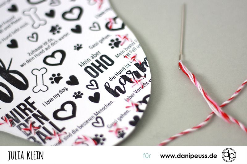 Wer mag kann den Knochen dann auf sein Hintergrundpapier aufnähen, ich habe mich für das Sticken per Hand entschieden und einfach ein paar ungleichmäßige Xe an den Rand gestickt. Mit doppelseitigem Klebeband aufkleben und entsprechend nach Wunsch weiter dekorieren. Fertig! :)