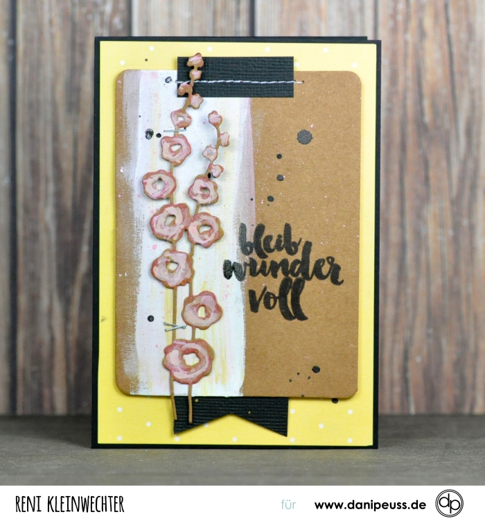 Material: Juni Kartenkit, weiße Acrylfarbe, Tim Holtz Oxyde Ink Pad "Worn Lipstick" und "Fossilized Amber", schwarzer Cardstock, Tsukineko Versafine Stempelkissen "Onyx Black", Tim Holtz Tiny Attacher Tacker, schwarzer Farbspray, Blume Stanzform (ähnlich Tim Holtz Thinlits "Wildflowers" bzw. KesiArt "Bellis"), Sizzix Big Shot Stanzmaschine