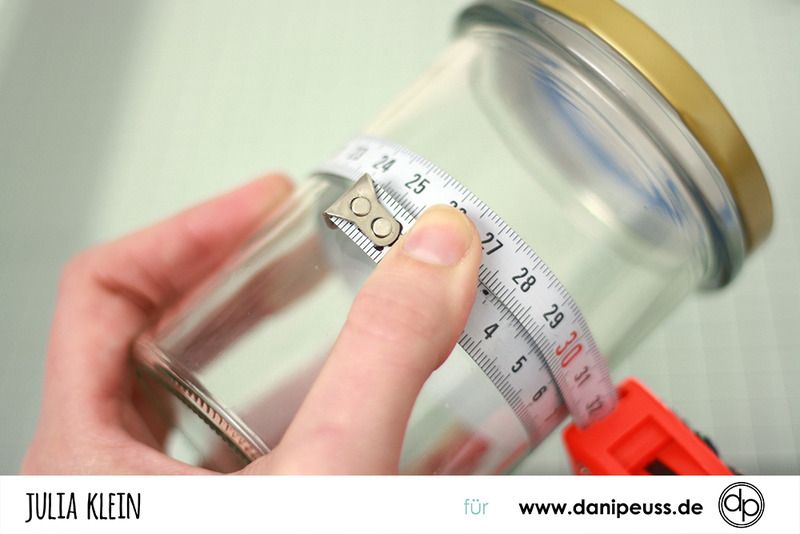 Mit dem Maßband wird der Umfang des Glases und auch die Höhe auf der die Folie nachher das Glas verdecken soll ausgemessen.