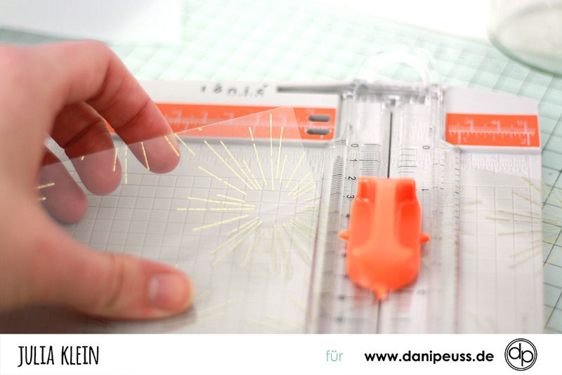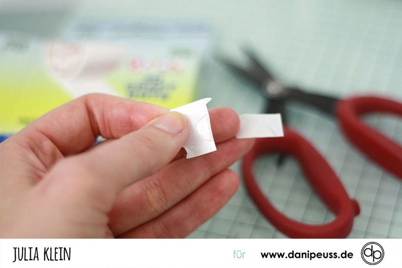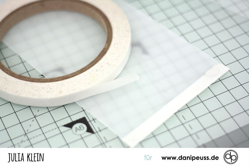 doppelseitiges Klebeband an eine der kurzen Kanten des Transparentpapiers und auf die Rückseite, an die selbe Kante, Glue Dots. Ich habe mich beim shoppen letztes Mal vertan und die XXL Version der