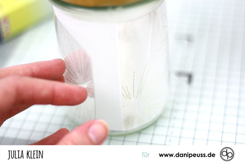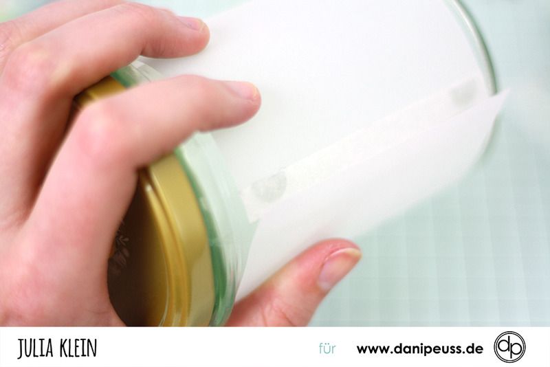 Richtet euer Transparentpapier zum umwickeln des Marmeladenglases gerade aus und klebt es mit den Glue Dots an dem Glas fest. Drum herum wickeln und auf der anderen Seite dann wieder festkleben, dafür haben wir das doppelseitige Klebeband angebracht. Die erste Schicht wäre damit also fertig und wir machen dasselbe nochmal mit der Acetatfolie. Aber Achtung: hier bei der ersten Klebeschicht nicht die Glue Dots verwenden sondern direkt das doppelseitige Klebeband.