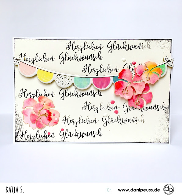 Bei unseren letzten Kartenchallenges hatten wir aus vielen wundervollen Karten Katjas Karte als zweite Gewinnerin gewählt und sie gleichzeitig eingeladen, als Gastdesignerin für eine neue - diese - Challenge aufzutreten. Das ist ihre Inspiration für diese Challenge. Mit dem mehrfach gestempelten "Herzlichen Glückwunsch" und den verwischten Rändern erzeugt Katja einen tollen vintage Hintergrund: