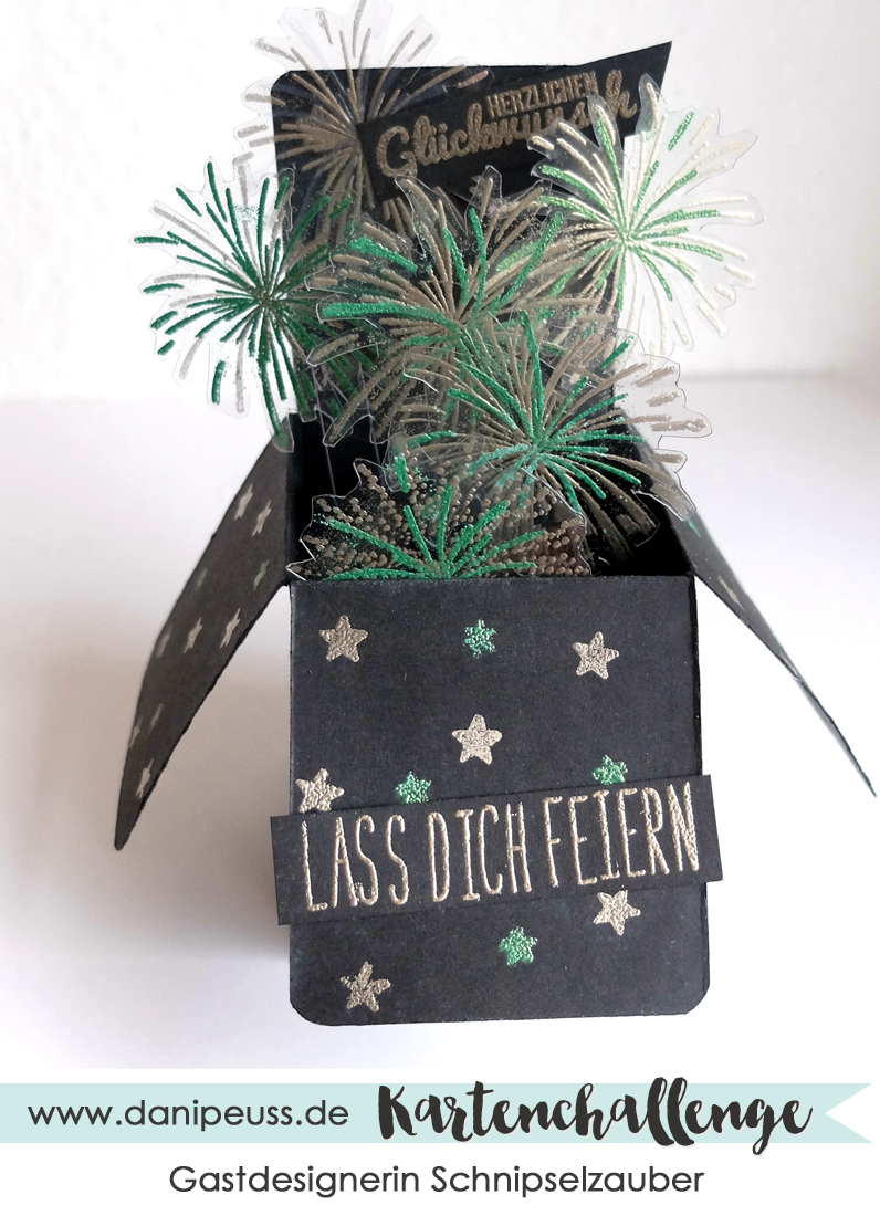 Bei unseren letzten Kartenchallenges hatten wir aus vielen wundervollen Karten Nicole als zweite Gewinnerin gewählt und sie gleichzeitig eingeladen, als Gastdesignerin für eine neue - diese - Challenge aufzutreten. Das sind ihre wunderschönen Inspirationen für diese Challenge, eine Pop-Up-Box Karte mit dem Klartext Stempelset "Feuerwerk":