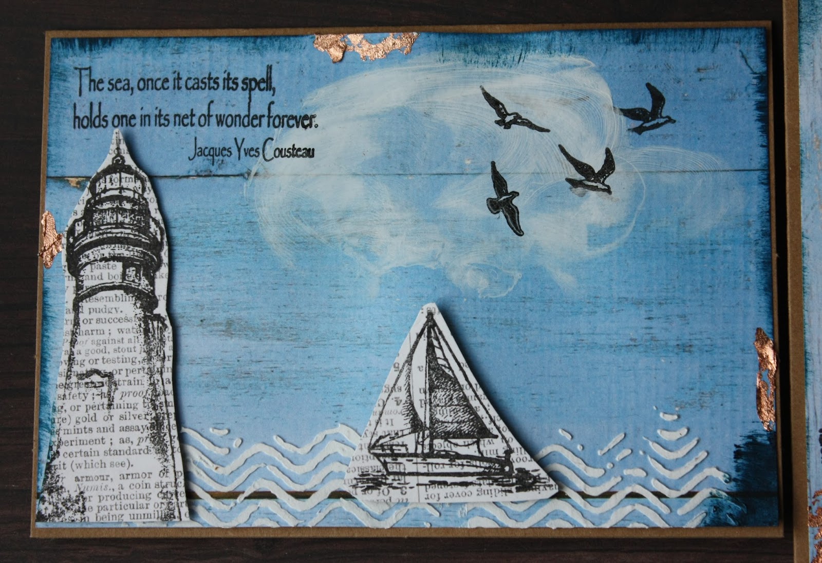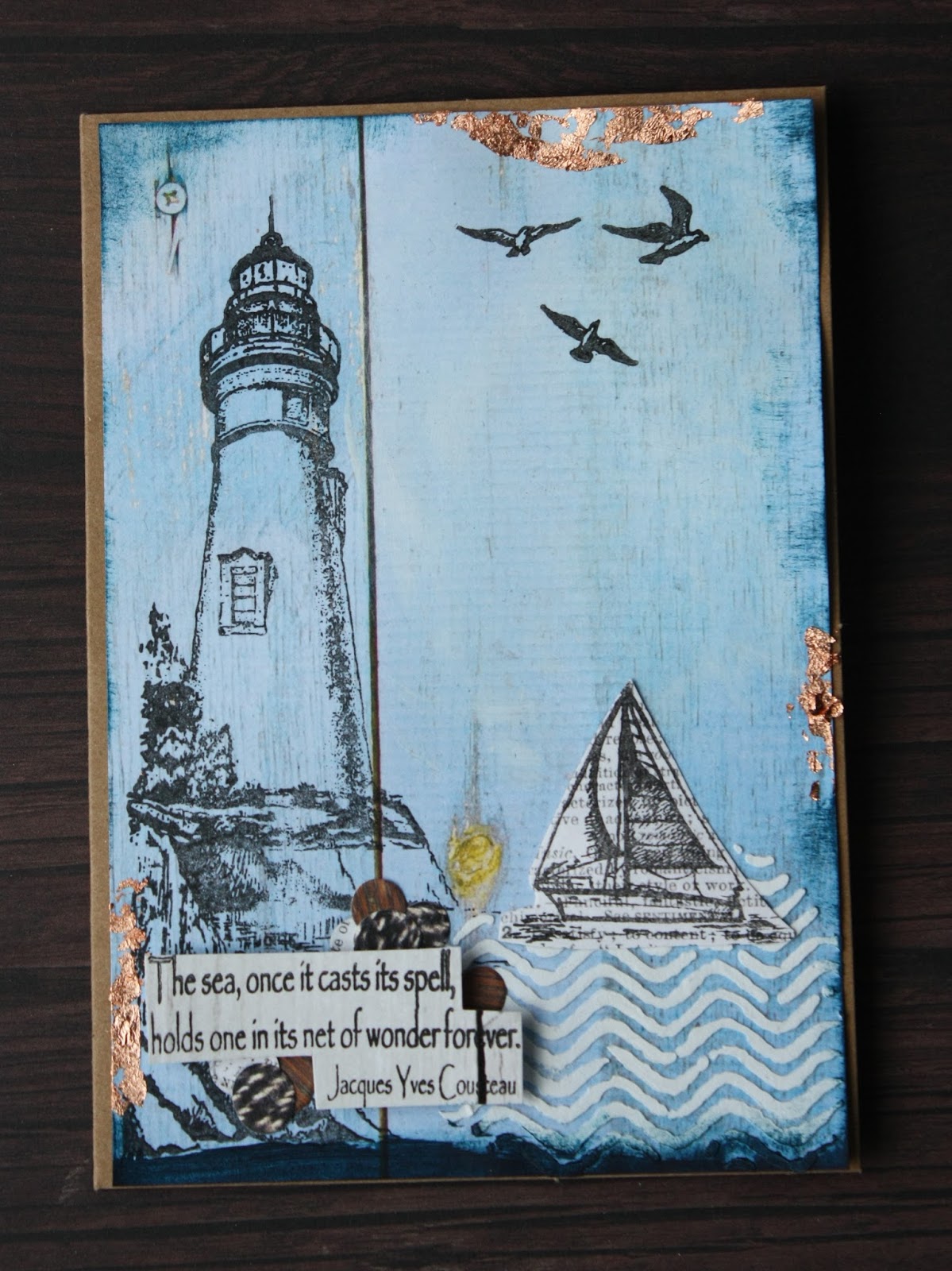 Nach langer Zeit bin ich auch mal wieder angestachelt meinen Beitrag zu posten. Weil Blau einfach meine Farbe ist. Meine Karten sind ja fast immer blau. Liegt vielleicht auch daran, das ich das Meer so sehr liebe. Bei meinen Karten benutze ich vor allem altes Papier Kalender, Zeitschriften, Bücher und alte Seekarten, alles was mir so über den Weg läuft. In diesem Sinne mehr Recycling!