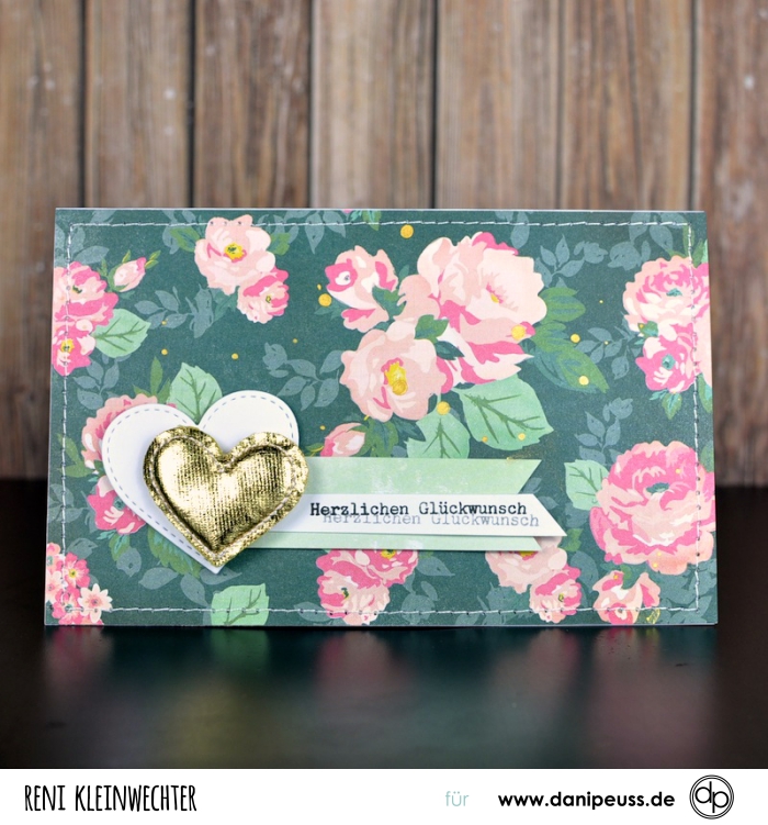 Material: Designpapier aus 6x6" Paper Pad Maggie Holmes "Chasing Dreams" (Garden Club), weißer Cardstock, Klartextstempel "Glückwunsch", Abstandsklebeband, Crate Maggie Holmes "Chasing Dreams" Puffy Heart Embellishment, Herz Stanzform (ähnlich hier), Sizzix Big Shot