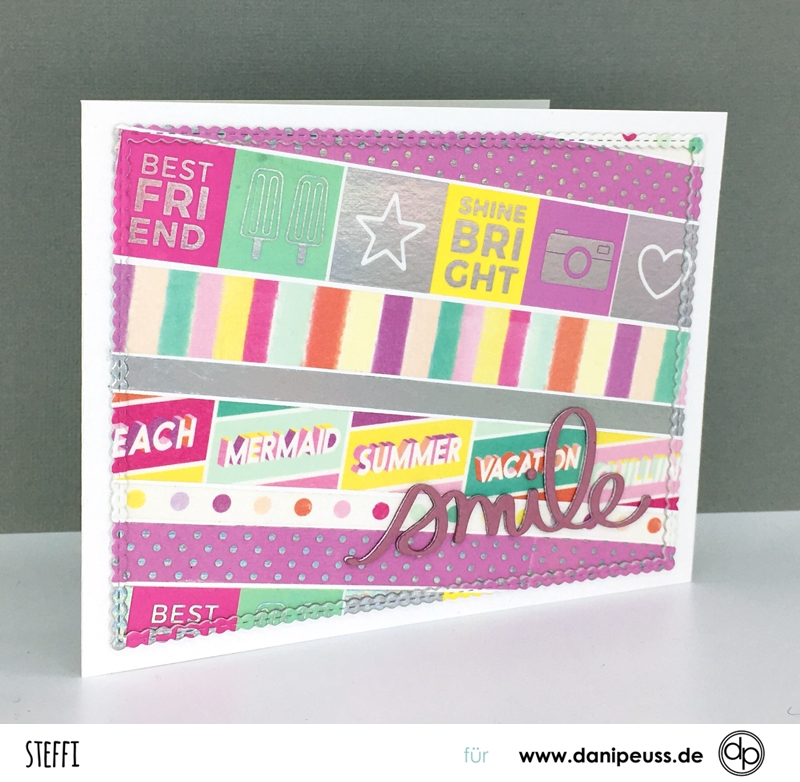 Bei unserer letzten Kartenchallenge hatten wir aus vielen wundervollen Werken Steffis Werk als zweite Gewinnerin gewählt und sie gleichzeitig eingeladen, als Gastdesignerin für eine neue - diese - Challenge aufzutreten. Das ist ihre Inspiration für diese Challenge. Sie hat auf ihre Karte mehrere Streifen Washi Tape aneinander geklebt und mit einem Rahmen Die ausgestanzt: